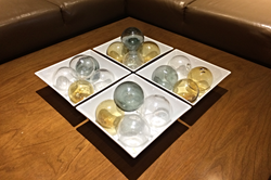 Within walking distance of the beach, this beautiful hotel boasts a sophisticated yet relaxing lobby with comfortable couches and wooden tables along the wall opposite reception. Glass spheres, blown by myself and my friend Ari Stein, are displayed in porcelein bowls on a number of tables throughout the lobby.